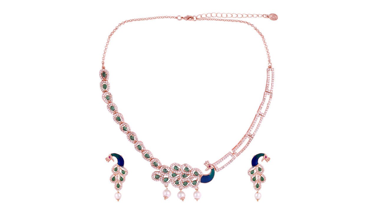 At the heart of Mor Bagh lies meticulous craftsmanship. The jewellery is created using a premium brass alloy base with anti-tarnish coating, finished with rich 22K gold micro-plating* for a high-shine festive appeal. AAA-grade CZ diamonds lend exceptional brilliance, while deep red hydro rubies add a regal touch. Each piece is further elevated with hand-painted meenakari in traditional blue and green hues, assembled entirely by hand to ensure precision and finesse.